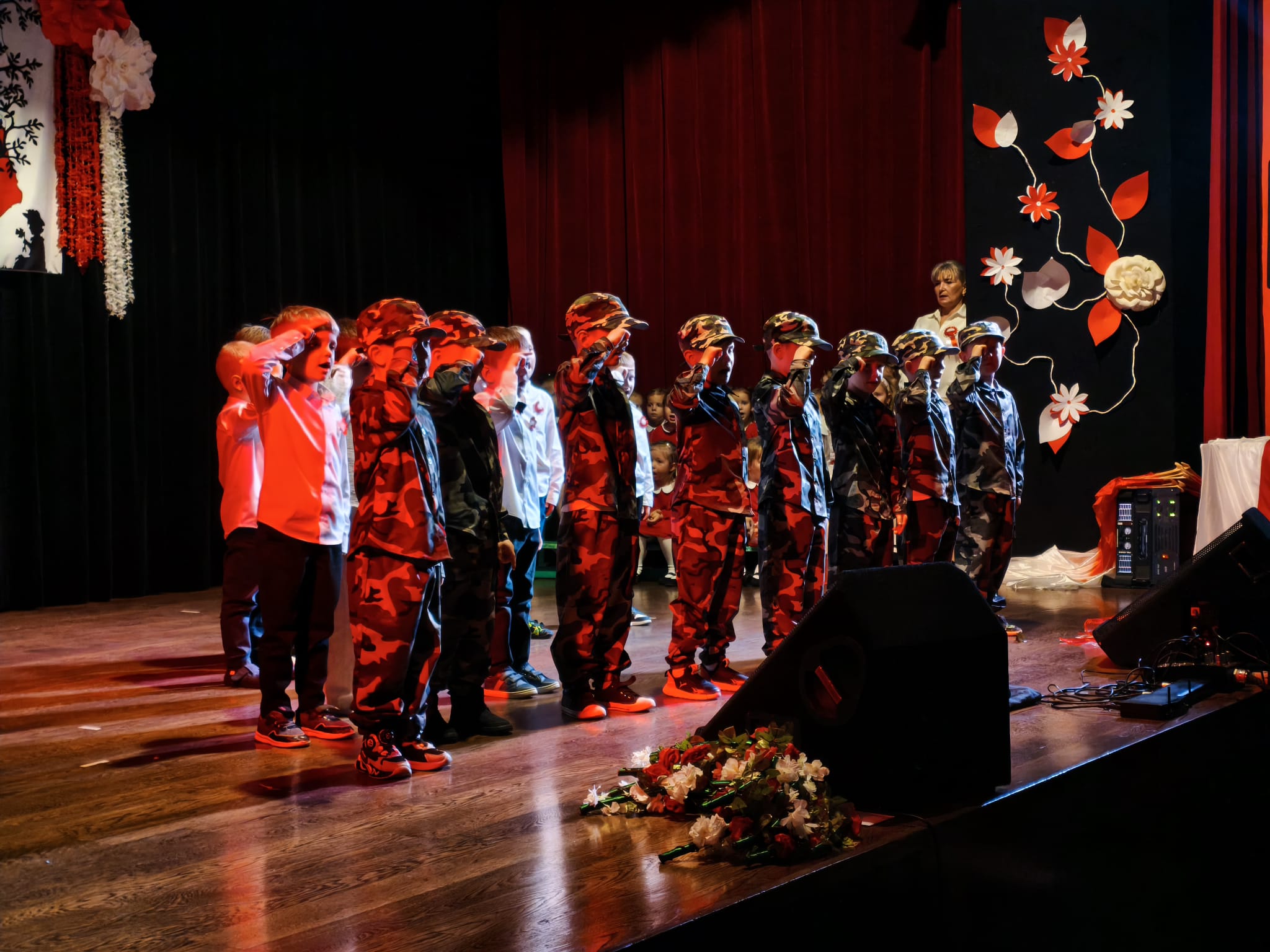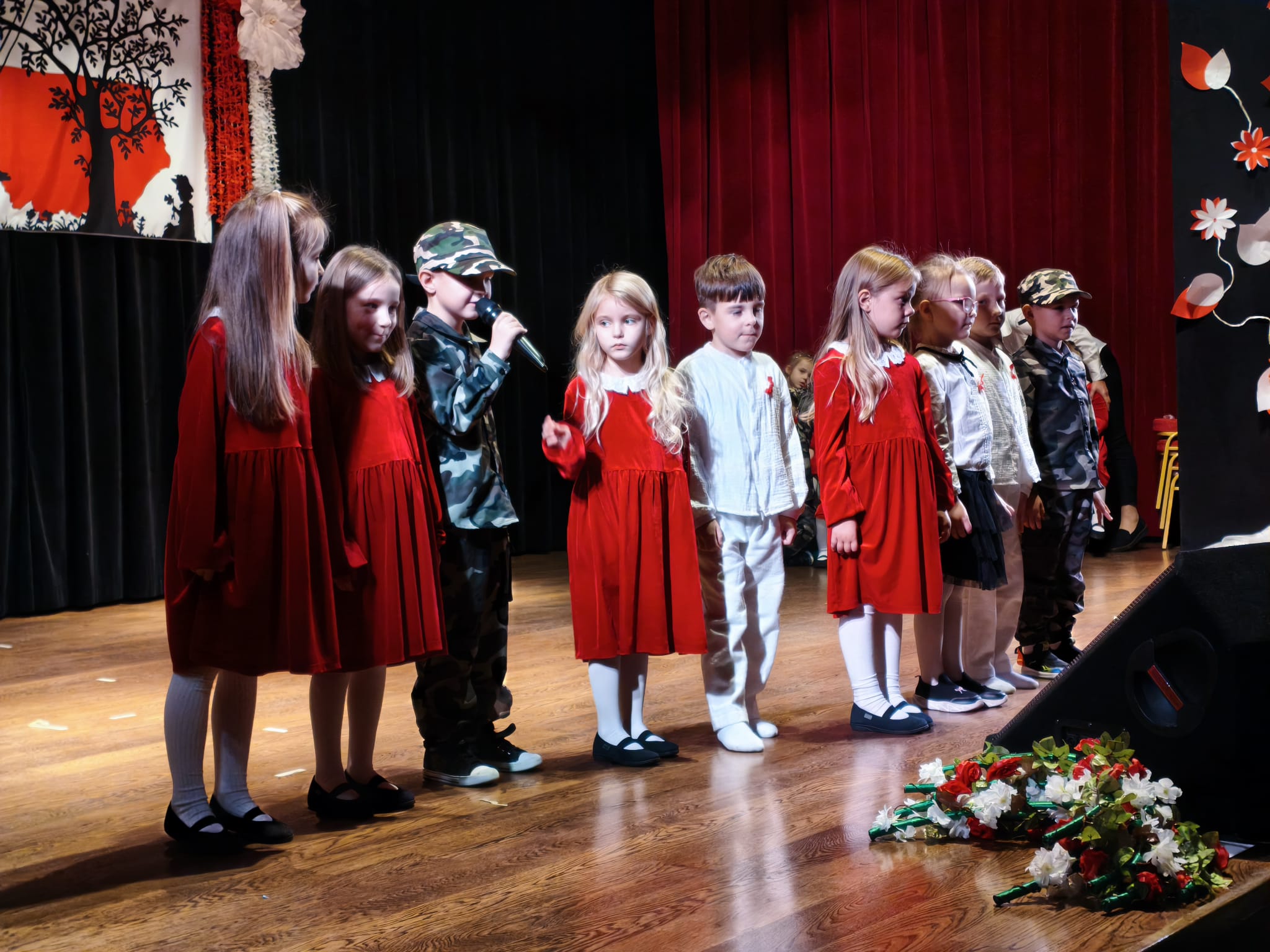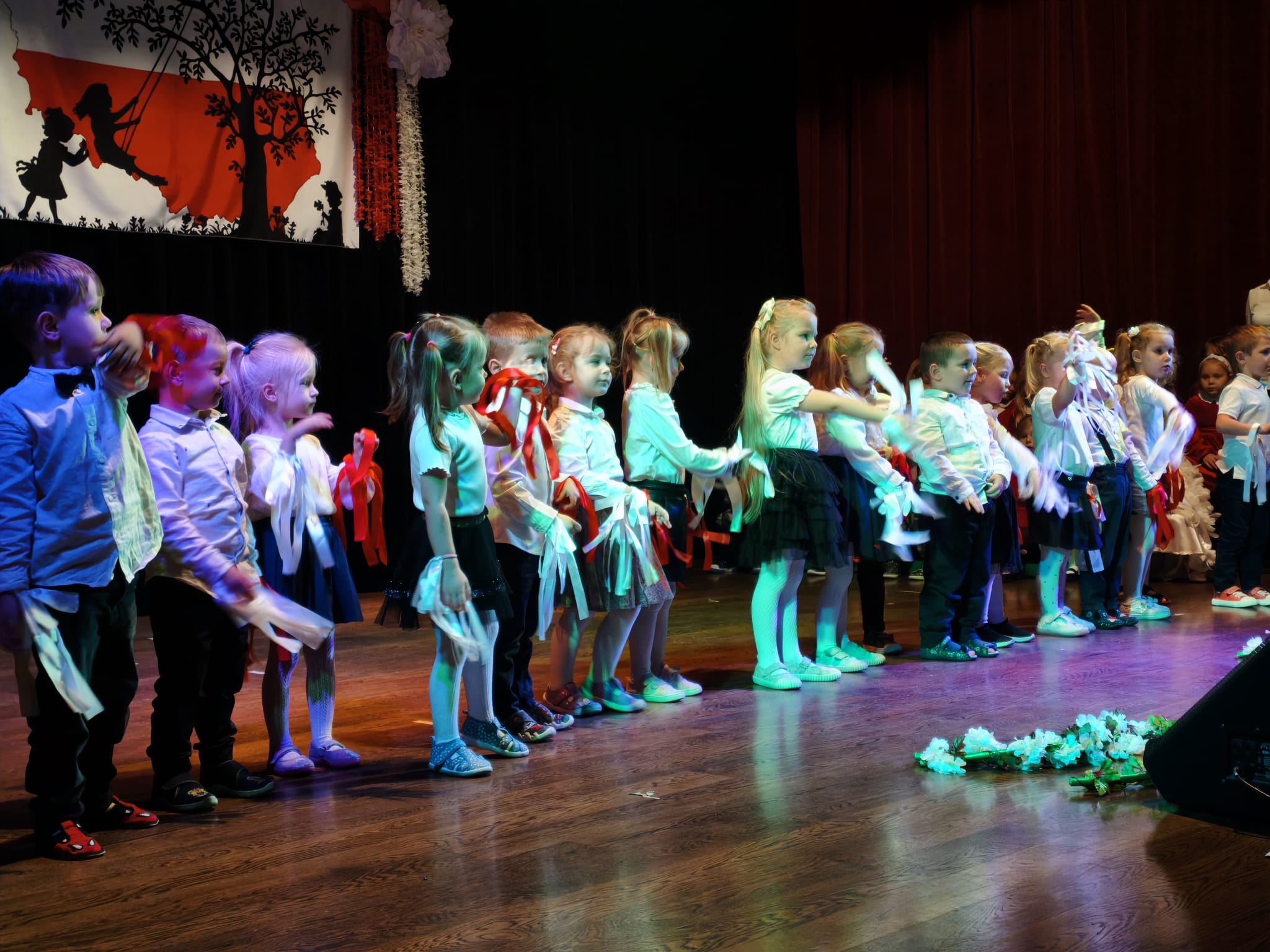 Dzieci z grup Żabki, Motylki,Biedronki i Pszczółki przygotowały wzruszający program artystyczny – z wielkim zaangażowaniem recytowały wiersze patriotyczne, śpiewały piosenki o Polsce oraz prezentowały układy taneczne w barwach biało-czerwonych.