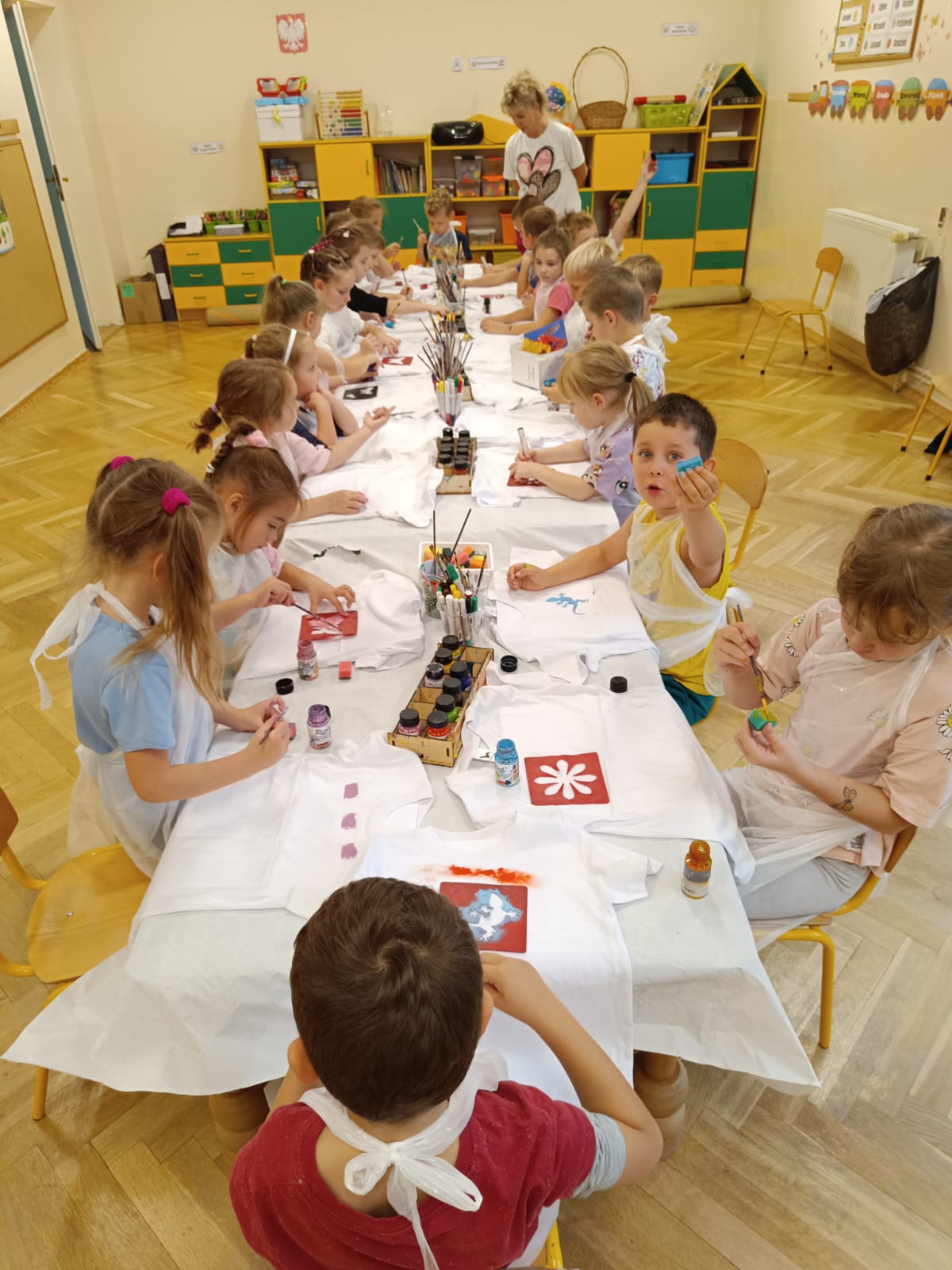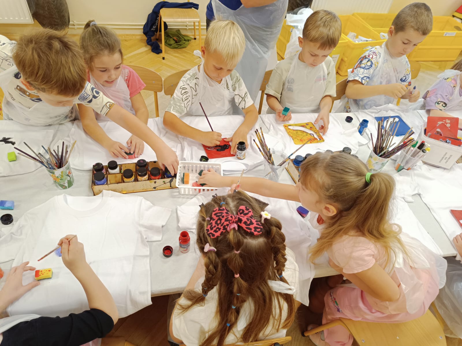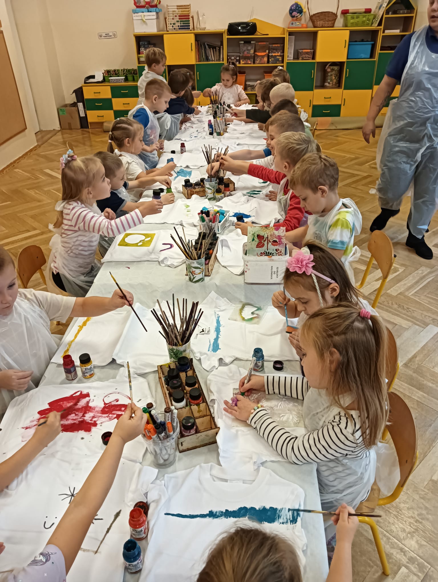 W dniu 09.10.2025 roku w naszym przedszkolu odbyły się warsztaty ekologiczne "MALOWANIE NA KOSZULKACH". Animator z firmy ModraSova w ramach projektu SmartPrzedszkolaki w Powiecie Dzierżoniowskim podczas warsztatów opowiadała przedszkolakom o metodach barwienia tkanin, a następnie przekazała wszystko w ręce dzieci.