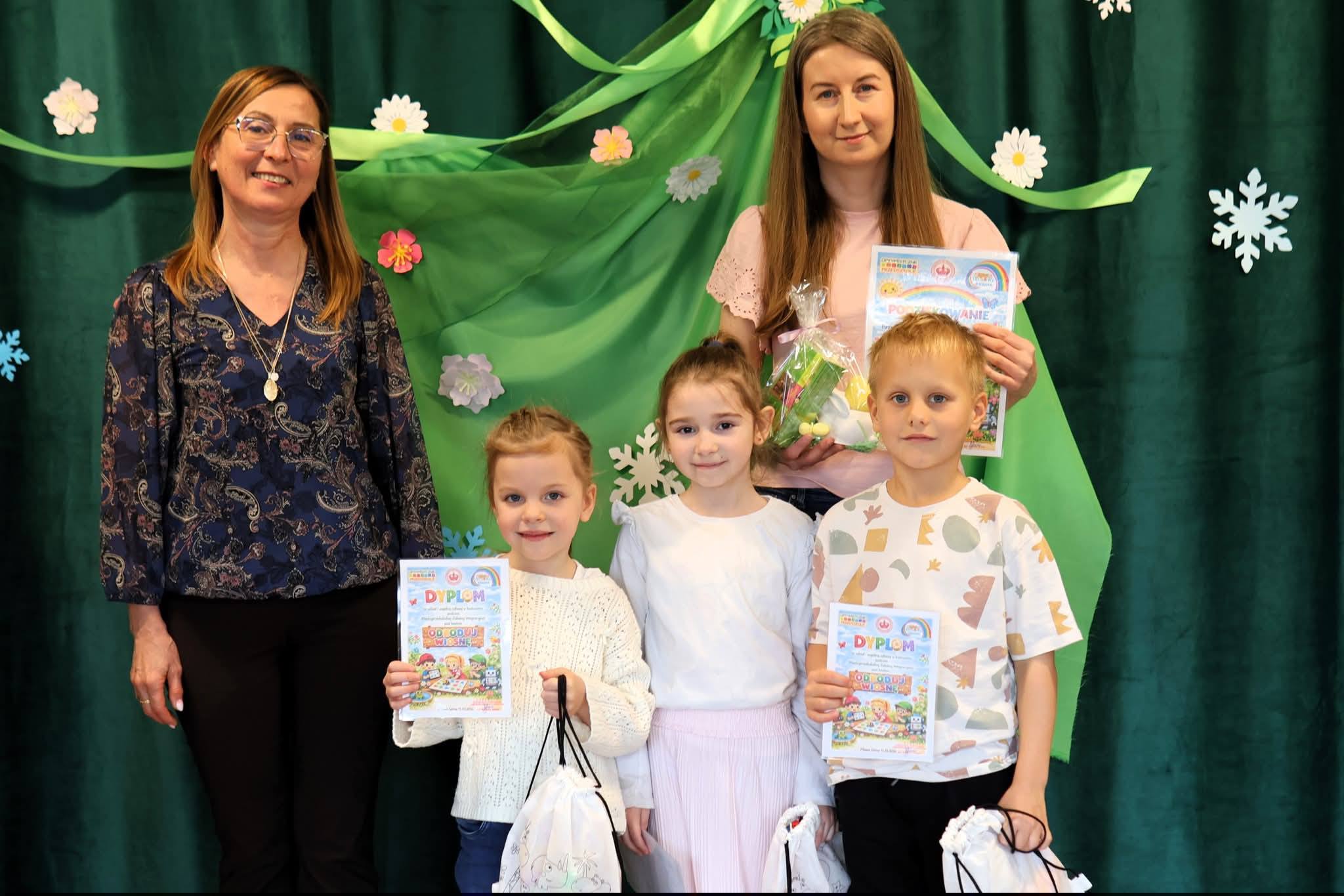 W Dzień Matematyki 12 marca 2026 roku w Przedszkolu Publicznym „Tęczowa Kraina” w Piławie Górnej odbyła się Międzyprzedszkolna Zabawa Integracyjna pod hasłem „Odkoduj Wiosnę”. Wydarzenie to na stałe wpisane jest w tradycję przedszkola integrując najmłodszych z różnych placówek regionu. W spotkaniu uczestniczyły dzieci z 11 przedszkoli z powiatu dzierżoniowskiego – m.in. z Dzierżoniowa, Bielawy, Pieszyc, Łagiewnik, Niemczy oraz ze Specjalnego Ośrodka Szkolno-Wychowawczego w Piławie Górnej. Spotkanie rozpoczęło się wspólnym powitaniem i integracyjnym tańcem do piosenki „W marcu jak w garncu”, który wprowadził wszystkich w radosny, wiosenny nastrój. Następnie dzieci przystąpiły do wykonywania przygotowanych zadań edukacyjnych. Sala została podzielona na 11 stanowisk pracy, przy których zespoły działały równocześnie, realizując kolejne etapy zabawy. Przedszkolaki rozwiązywały różnorodne zadania rozwijające logiczne myślenie, współpracę i umiejętności matematyczne. Wśród nich znalazło się m.in. „Marcowe gotowanie pogody”, podczas którego dzieci – zgodnie z przepisem – dodawały do symbolicznego garnka promienie słońca, krople deszczu czy chmury. Uczestnicy układali także kolorowe sekwencje z kubeczków, tworzyli wiosenne puzzle i kolorowali dyktando graficzne i układali zwiastuny wiosny według instrukcji słownej. Szczególną atrakcją wydarzenia było spotkanie z robotem Indi, który został zakupiony dzięki grantowi Fundacji mBanku w programie „Rosnę z matematyką”. Niebieski robot porusza się dzięki językowi kolorów, a dzieci wspólnie programowały jego trasę, aby pomóc mu „odkodować wiosnę”. Nowoczesna forma zabawy wywołała ogromny entuzjazm wśród uczestników i była dla nich ciekawym wprowadzeniem do świata kodowania i nowych technologii. W trakcie całego spotkania panowała radosna atmosfera, a na twarzach dzieci nie brakowało uśmiechu. Wydarzenie było nie tylko okazją do nauki poprzez zabawę, lecz także do nawiązywania nowych znajomości i budowania współpracy między przedszkolami z powiatu dzierżoniowskiego. Na zakończenie wszystkie drużyny otrzymały pamiątkowe dyplomy, upominki, wykonały wspólne zdjęcie i udały się na poczęstunek. Jedno jest pewne – wiosna została odkodowana!
