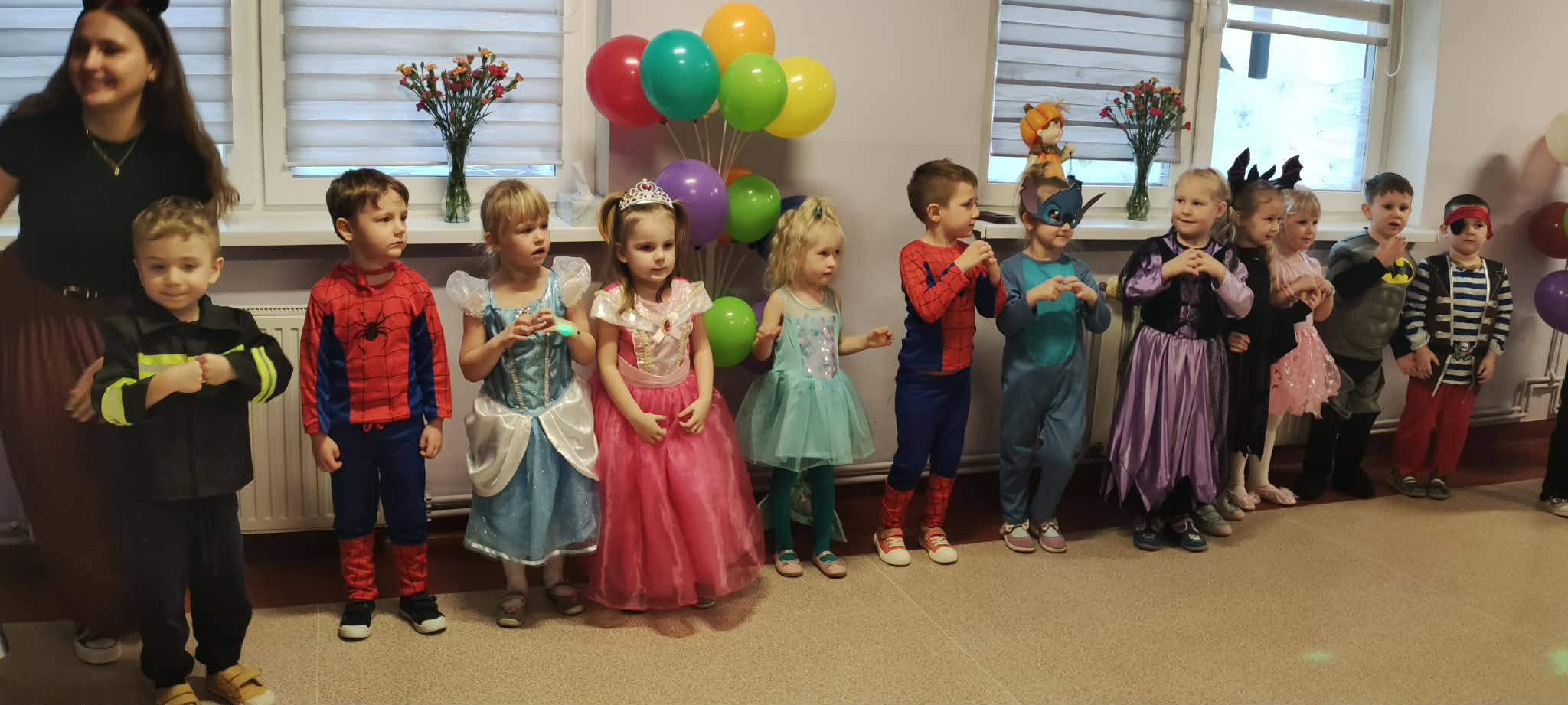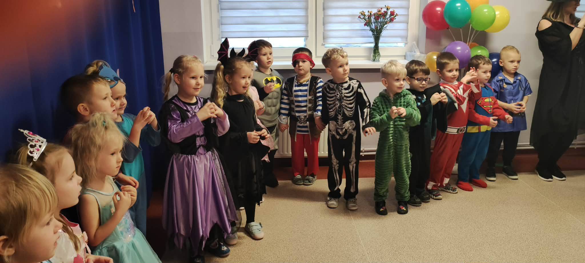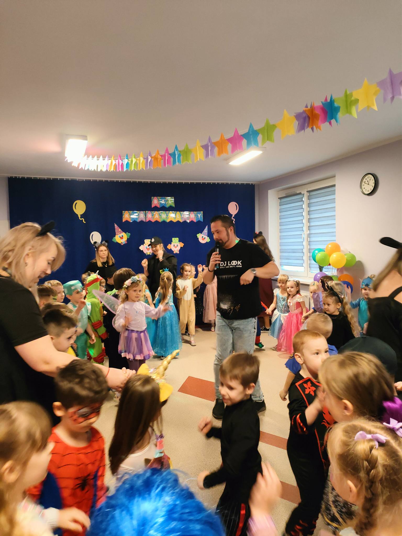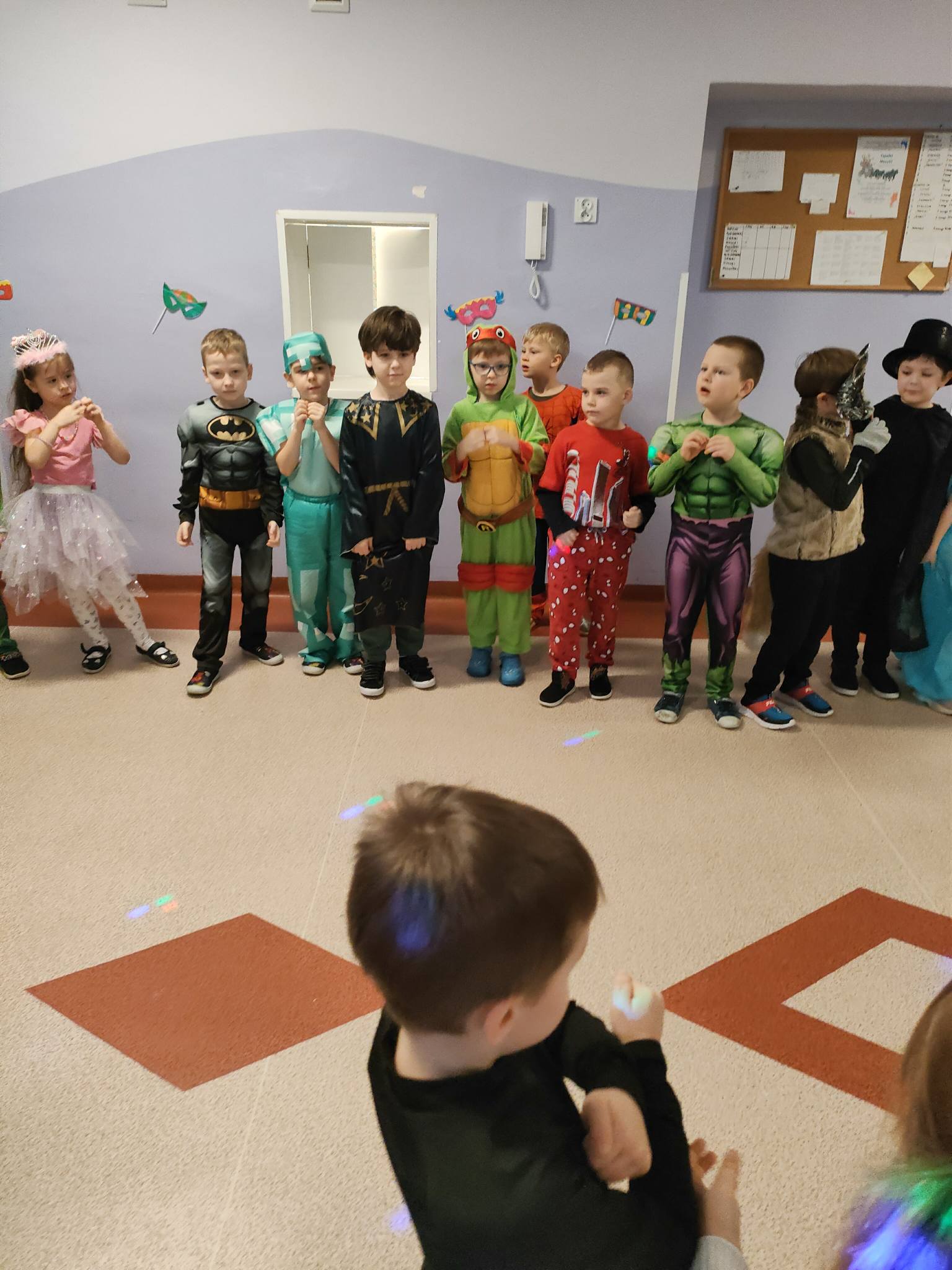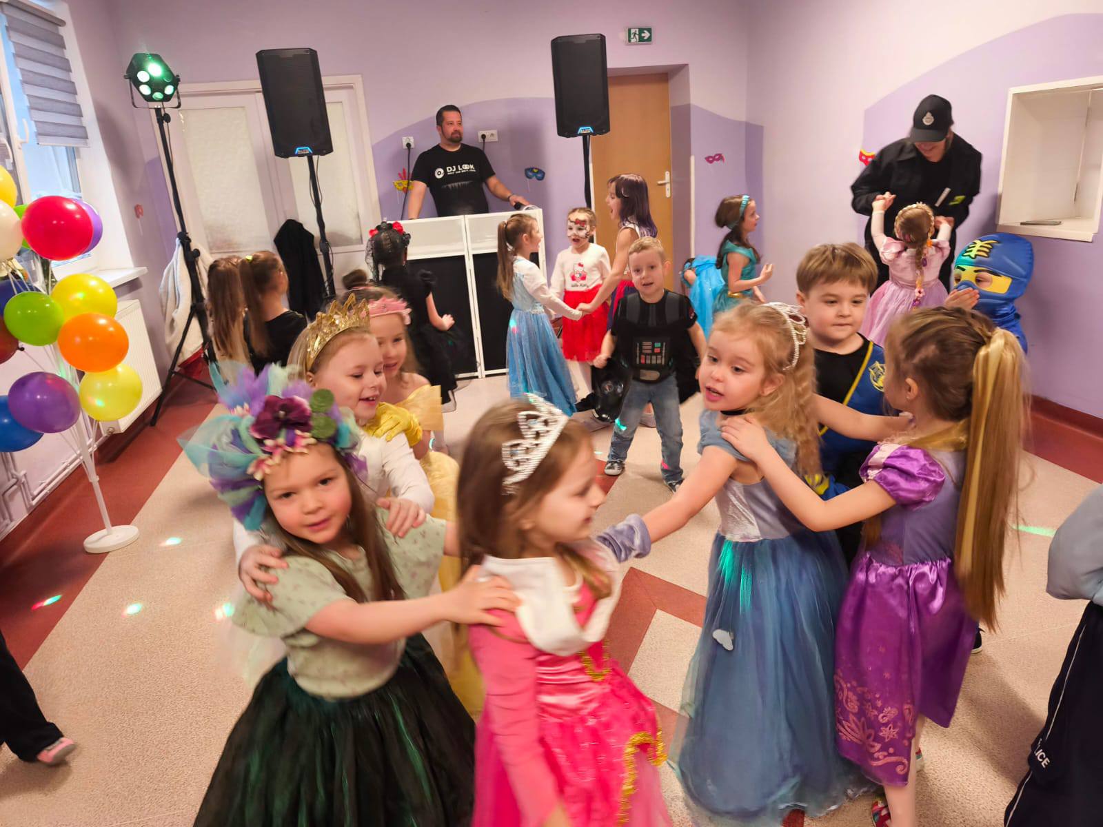 Tego dnia już od rana w przedszkolu pojawiały się kolorowe postacie. Przedszkolaki przebrane były za bohaterów z różnych bajek, filmów oraz za służby mundurowe. W salach przedszkolnych można było spotkać między innymi: wróżki, królewny, rycerzy, piratów, policjantów, nie sposób zliczyć i wymienić tych wszystkich postaci. Wszyscy wyczekiwali wspaniałej zabawy. Kiedy pojawiły się pierwsze rytmy wesołej muzyki dzieci z wielką ochotą rozpoczęły pląsy i tańce w rytm swoich ulubionych utworów dedykowanych przez DJ-a. Uśmiech nie znikał z twarzy przedszkolaków mimo chwilowego zmęczenia.